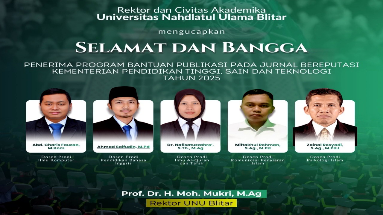 MATABLITAR.COM – Lima dosen Universitas Nahdlatul Ulama (UNU) Blitar dinyatakan lolos sebagai penerima Program Bantuan Publikasi pada Jurnal Bereputasi Tahun 2025 yang diselenggarakan Kementerian Pendidikan Tinggi, Sains, dan Teknologi (Kemdiktisaintek).