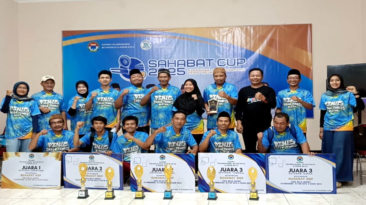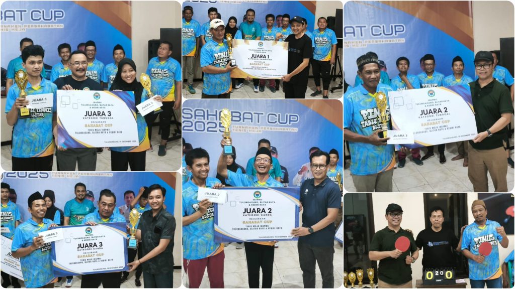 MATABLITAR.COM – Kontingen PC IKA PMII Blitar Raya tampil gemilang dalam ajang Turnamen Tenis Meja Sahabat Cup 2025. Bertanding di Graha Kebangkitan, Tulungagung, Selasa (16/12/2025), tim Blitar Raya sukses menunjukkan dominasinya dengan memborong 6 dari total 9 piala yang diperebutkan.